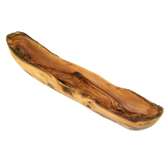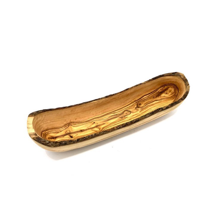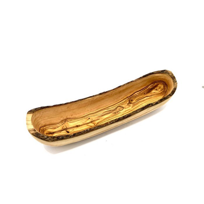 Duonos dubuo „RUSTIC“ – ilga, natūralios formos alyvmedžio dubenė, puikiai tinkanti bagetėms ir duonai; taip pat tinka daržovėms, vaisiams ar mišriems užkandžiams. Išraiškingas medienos raštas ir gyva kraštelio linija traukia akį, o stabilus korpusas gražiai atrodo ant stalo kasdien ir šventėse.
